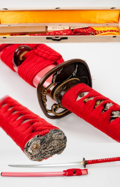 Stainless steel blade, unsharpened with hamon 24 inches from tip to tsuba, with bo-hi. Overall length including saya about 35 inches. The Ito is Red silk over White Rayskin. Tsuka is double pinned with bamboo mekugi, cotton Ito wrapped with hishigami paper. Iron Wisteria design Tsuba. Weight without saya 2.05 lbs. Saya is wood with high gloss Pink lacquer finish. 3 pc bullhorn, Red silk Sageo.